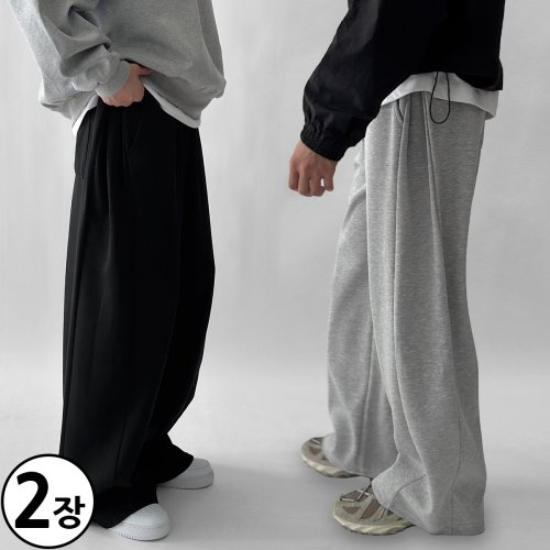 [기획상품 1+1] 두장묶음 빠델 사이드핀턱 벌룬 와이드 트레이닝 스웻 커브드 팬츠 회색 트레이닝팬츠, 그레이+블랙, L(Free)