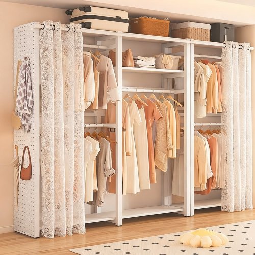 드레스룸 시스템 철제 행거 튼튼한 스탠드 행거 오픈형 조립식 원룸옷장, 2000mm, 흰색(A+C)전면 커튼+양쪽 타공판